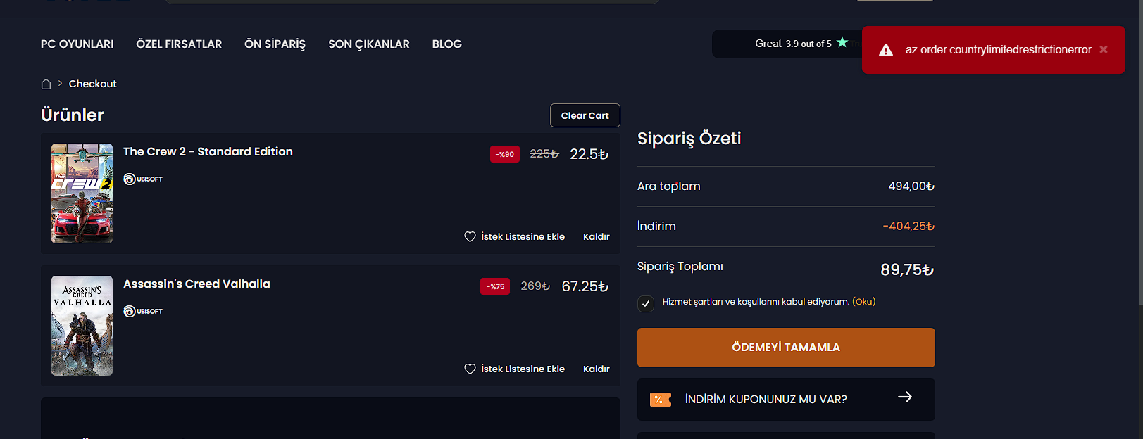 Arkadaşlar AC Valhalla almak istiyorum ve sürekli hata veriyor. Sepete başka bir oyun eklediğimde ise satın alımda bir sorun olmuyor.