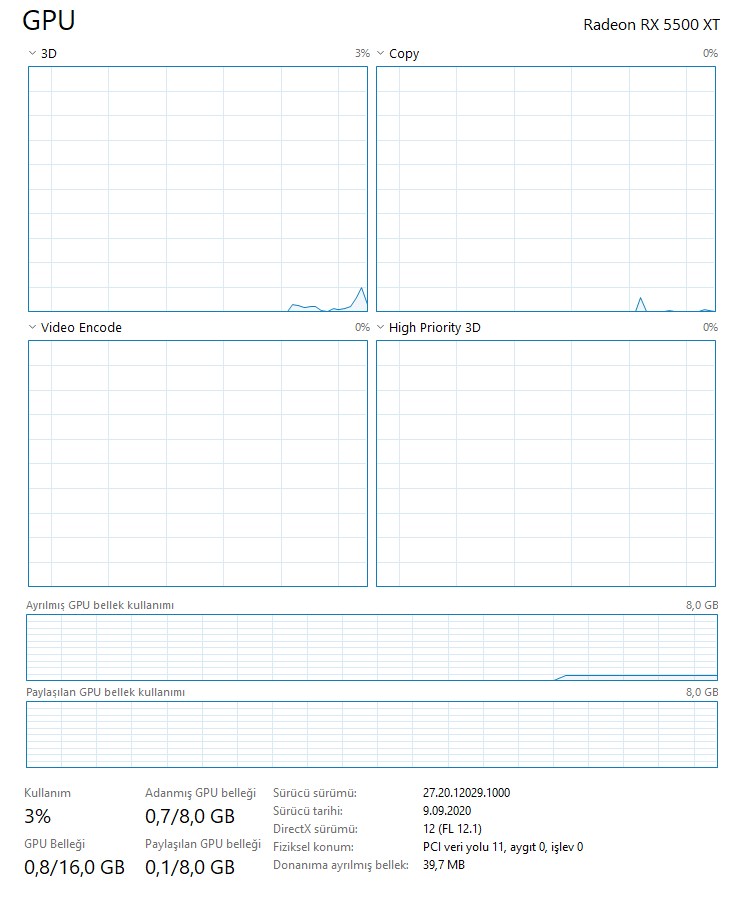 Arkadaşlar RX 5500 XT 8GB model ekran kartı kullanıyorum. Radeon Software açtığımda %50 VRAM kullanımı gözüküyor ama görev yöneticisinde 1GB kullanıyor gösteriyor sizce Radeon Software yanlış mı gösteriyor?. Fotoğrafları bırakıyorum.