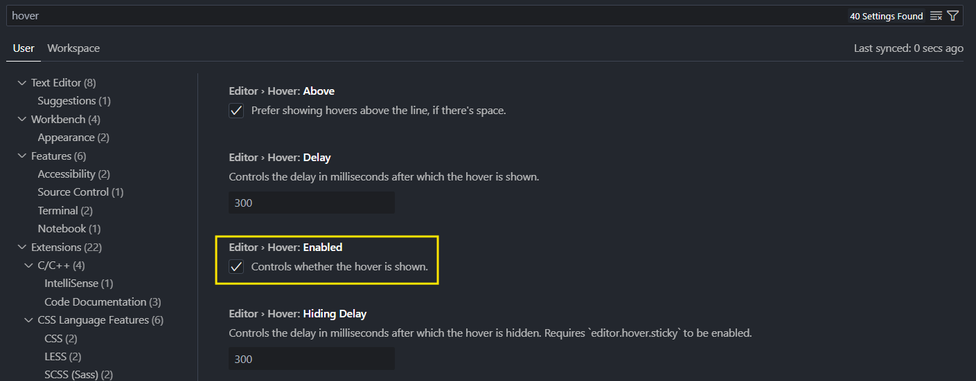Ctrl + , kombinasyonuyla veya File > Preferences > Settings'ten ayarlar sayfasını açtıktan sonra hover araması yapın. Ardından Editor > Hover: Enabled ayarının altındaki kutucuğun tikini kaldırarak bu özelliği devre dışı bırakabilirsiniz:Ctrl + ,kombinasyonuyla veyaFile > Preferences > Settings'ten ayarlar sayfasını açtıktan sonrahoveraraması yapın. ArdındanEditor > Hover: Enabledayarının altındaki kutucuğun tikini kaldırarak bu özelliği devre dışı bırakabilirsiniz:
