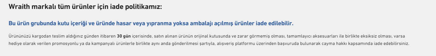 Mouse ürünlerinde iade politikası: Sadece ambalajı açılmamış ürünler 14 gün içerisinde iade edilebilir. Bu ürün grubunda iade koşulları ile ilgili daha fazla bilgi almak için iade politikamıza göz atabilirsiniz. Ürün garantisi: Ürün 2 sene boyunca garanti kapsamındadır. Kullanıcı hatasından...wraithesports.com
