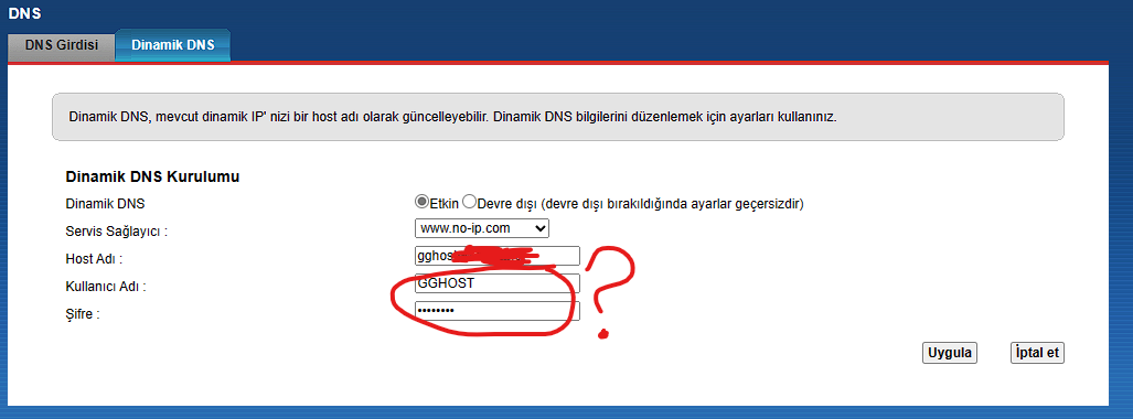 Daha sonra modem arayuzunden DNS kismindan dinamik DNS bolumune yazdim.