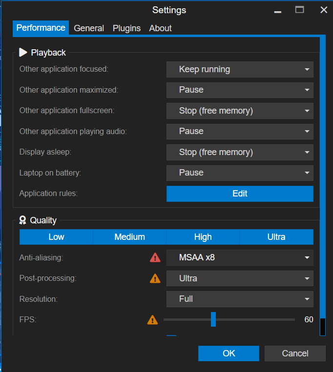 Dün Wallpaper Engine'de birkaç ayar değiştirdikten sonra oyunlar açılırken kasmaya başladı. Ayarlara baktığımda çok anormal bir şey yapmadığımı görüyorum fakat yine de size göstereyim. Dün WE'yi kapayıp denerken hızlıca girmişti, ama bugün tekrar kapamış olmama rağmen değişen bir şey olmadı. Belki programdan kaynaklıdır ve hem de ayarlar varsayılana döner diye silip yükledim fakat yine değişen bir şey olmadı. Sorunun kaynağı başka da olabilir ama bilemiyorum. Ve dün oyuna girmeye çalışırken ekran gitti, düğmeden kapatmak zorunda kaldım. Oyunu Borderless Fullscreen'e aldığım zaman donma olmuyor. Ayrıca sadece oyuna girerken değil oyunda da kasıyormuş. @Enes3078