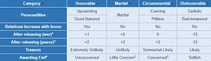 Bu da kişiliklere göre lordların verdiği tepkiler. Honorable olanların tek kötü yanı, lordları ile araları çok zor düştüğü için sizin tarafınıza gelmeleri de çok zor oluyor. Onursuz olanlar ise en berbatları, savaşta serbest bırakırsanız bile - yiyorsunuz adamlarla, tam bir baş belası onlar.