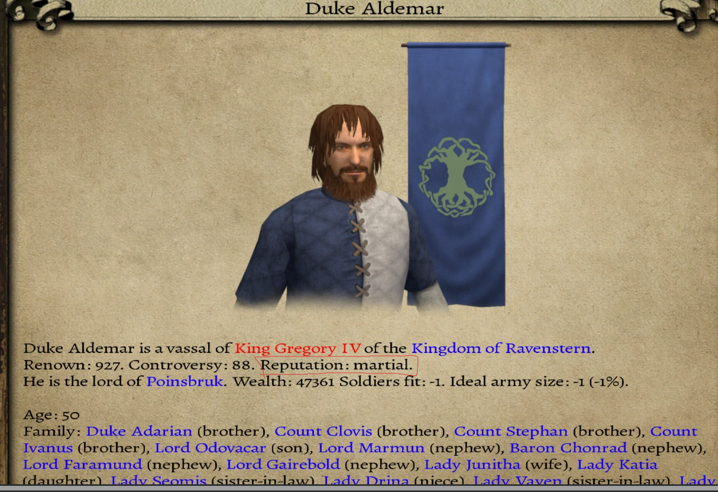 Normal oyunda gözüküyor muydu hatırlamıyorum da, her lordun bu şekilde reputationu var, mesela bu martial, honorable olmasa bile idare etmeleri nispeten kolay bunların da.