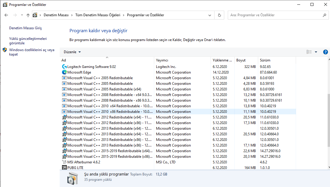 Buradaki yüklü olan Visual C++ hepsini silip toplu yükleme paketini yükleyin sonra Windows güncelleme kontrolü yapın, DirectX son sürüm olsa bile güncellemeyi deneyin, Net. Framework 4.7.2 sürümünü yüklemeden önce silmeniz gerekli, Bu işlemleri yaptıktan sonra sonuçları bizimle paylaşın