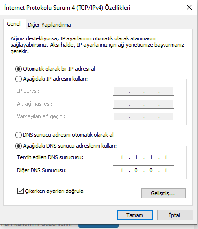 Aynı sorun ile karşılaştım. Sorunu kendim için çözdüm. Bir arkadaş sağ olsun siz de bir deneyebilirsiniz. Denetim Masası\Ağ ve Internet\Ağ ve paylaşım merkezi oradan kullandığınız ağı seçip özelliklere tıkladıktan sonra internet protokolü sürüm 4'ü seçiyoruz. Sonra fotoğraftaki gibi DNS ayarını yapıp çıkarken ayarları doğrula deyip kapatıyoruz oluyor.