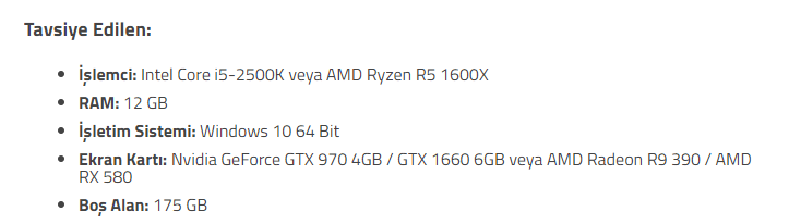 Sisteminiz RAM dışında tavsiye edilen sistem gereksinimlerinin üstünde.
