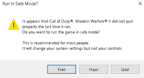 Buna hayır demenizi tavsiye ederim. Ansızın oyun kapandığı için güvenli mod da başlatmayı soruyor. Bir daha çıkarsa yine hayır diyerek geçin. Evet seçenegine tıklarsanız Grafik ayarlarınız değişir.Merhaba. PC'ye CoD Warzone indirdim ve eşleştirmeye girdim ama oyun çöktü. Ve bir hata verdi. Ama SS alamadım. Oyunu bir daha açmaya çalışınca resimdeki hatayı verdi.