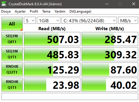 Dostlar, 240GB bir SSD aldım. WD Green SSD, ilk defa kullanıyorum. Montajı yaptım, Windows'u kurdum. Test sonuçları bunlar, sizce iyi mi değil mi?