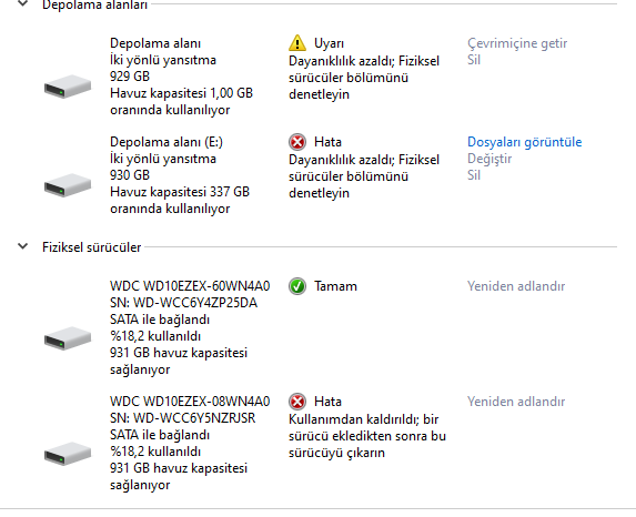 Gerekli tüm testleri yaptım disklerin saglık durumu iyi gözüküyor, bad sektör bulunamıyor ama 2 diskte çalışmıyor. Şu anki durumda e: Sürücüm gözüküyor ama işlem yapamıyor, F: Sürücüm ortada yok çevrimdışı gözüküyor. Çok uzun süredir kullandığımdan ömrü dolmuş olabilir mi yoksa başka bir problemmi var 1 günde 2 diskin gitmesi garip geldi.