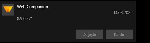 Web companion kaldırmak istiyorum fakat Denetim Masası program ekle veya kaldır yerinde yok. Uygulama kaldır ekle kısmında da böyle.