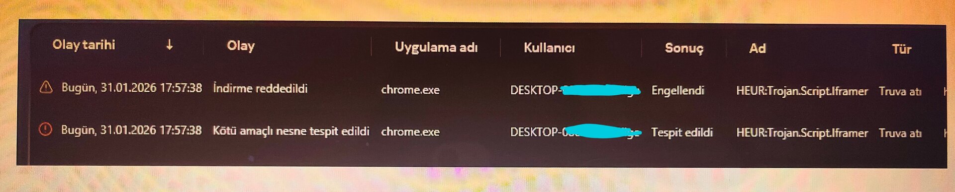 İnternette gezinirken eğitim gördüğüm okulun ismini arattım ve karşıma iki tane site çıktı. Ben de meraktan ikisine de bakmak istedim ve ikinci siteye girdikten 5 saniye sonra Kaspersky'dan ekteki gibi bir uyarı aldım. İndirme reddedildi dese bile yin ede içim rahat olamadı çünkü RAT'lerin bulaştıktan fark edilmesi çok zor. Bu konuda bana yardımcı olacak birisi var ise sevinirim.