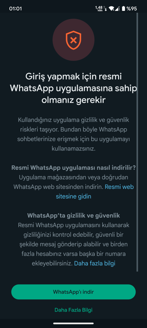 Modlu WhatsApp uygulaması kullanıyordum resmi uygulamaya geçin uyarısı verdiği için resmi uygulamayı yükledim, ama hala uygulamanın resmi olmadığını söylüyor ve giriş yapmama izin vermiyor. Bu sorunu yaşayıp da çözüm bulan oldu mu?