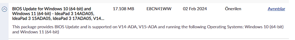 Lenovo yazılımını yükledim ve güncelleştirmeleri denetledim fakat herhangi bir güncelleme mevcut değil. Yani anlaşıldığı üzere BIOSta son sürümde.