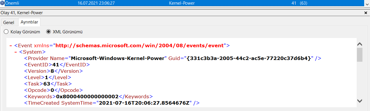 Açıkçası tam olarak ne paylaşmam gerektiğini bilmiyorum fakat olay görüntüleyiciden "Windows Günlükleri" sekmesine girerek "Sistem" bölümünde bilgisayarın mavi ekran verdiği saate tekabül eden hatayı paylaşıyorum: