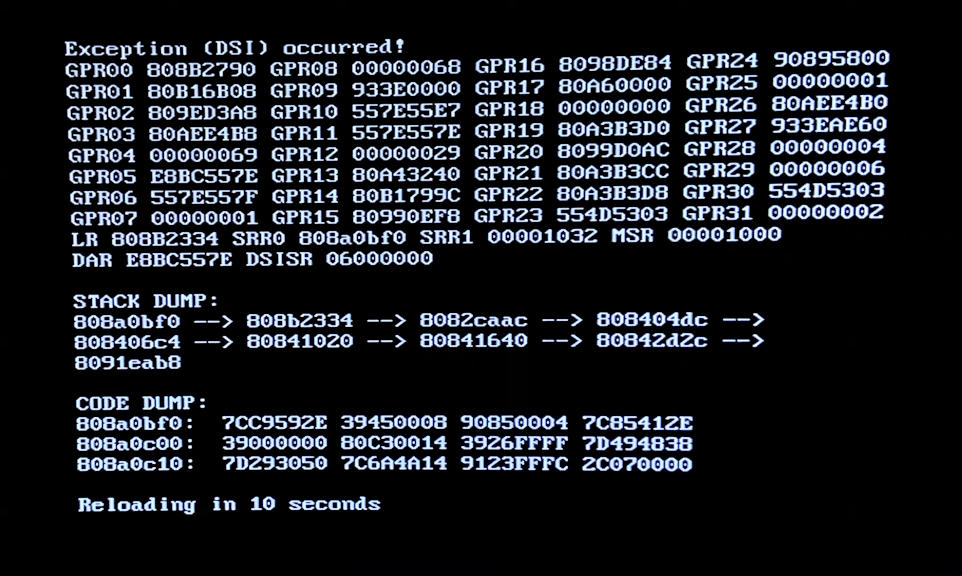 Ama bu son iki yilda spesifik bir hata vermeye basladi(ikinci fotoğraftaki gibi bir hata vermeye başladı ama ben ikinci fotoğrafı internetten buldum benzediği için), ne zaman USB loader gx kanalina girsem siyah ekranda bir hata veriyor ve ekranda karmasik numarali bilgiler var ki ben anlamadim.(konsol hala güzelce çalışıyor).