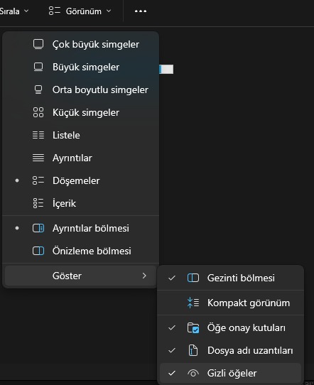 NOT: Dediğim işlemler için gizli dosyaları görünür hâle getirmelisiniz. Bunu dosya gezginindeki "görünüm" kısmından yapabilirsiniz.