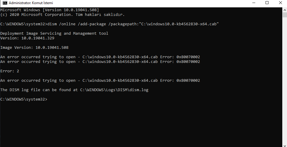 2020-09-19 00:13:17, Error                 DISM   DISM Package Manager: PID=11636 TID=1456 Failed to open the package at location: "C:\windows10.0-kb4562830-x64.cab" - CPackageManagerCLIHandler::ProcessPackagePath(hr:0x80070002)