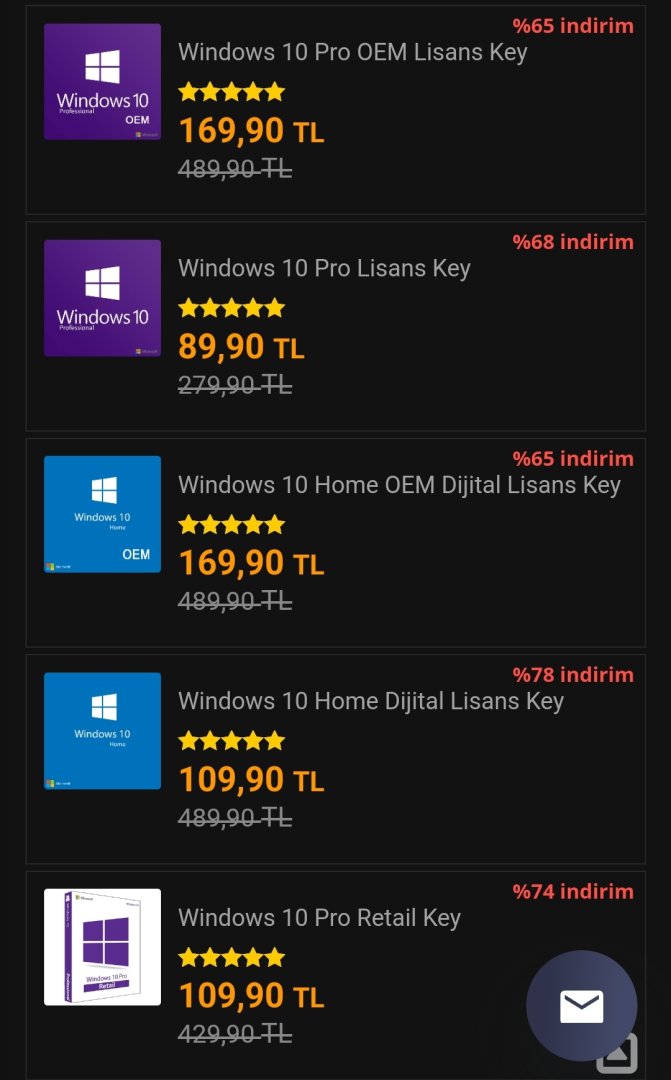 Görselde görüldüğü üzere Windows 10 pro için 3 farklı key var. Retail ve OEM farkını internetteki kaynaklarda da mevcut fakat 89 TL olan key nedir ne farkı vardır biliyor musunuz? Sağlamlisans sitesine sorduğumda normal lisans diyor. Diğerlerine göre daha uygun. Diğerlerinden farkını bilen var mı?