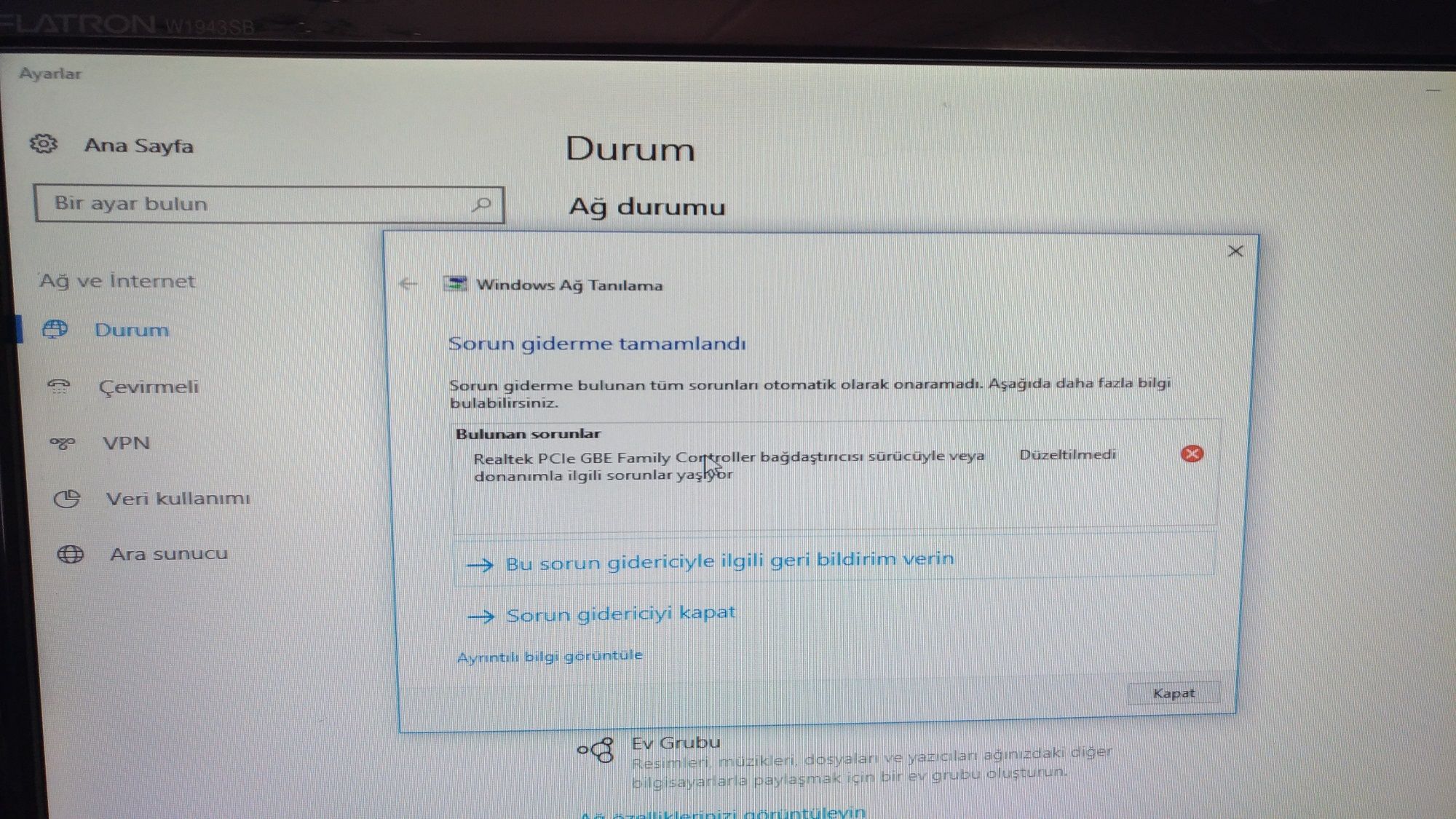 Genel tespitim Realtek PCI-e GBE family Controller ile ilgili. Realtek PCI-e GBE family Controller kod 10 hatası tespit ettim. İlave olarak aygıt yöneticisinden şimdi baktığımda ' ağ bağtaştırıcıları ' sonrasında.