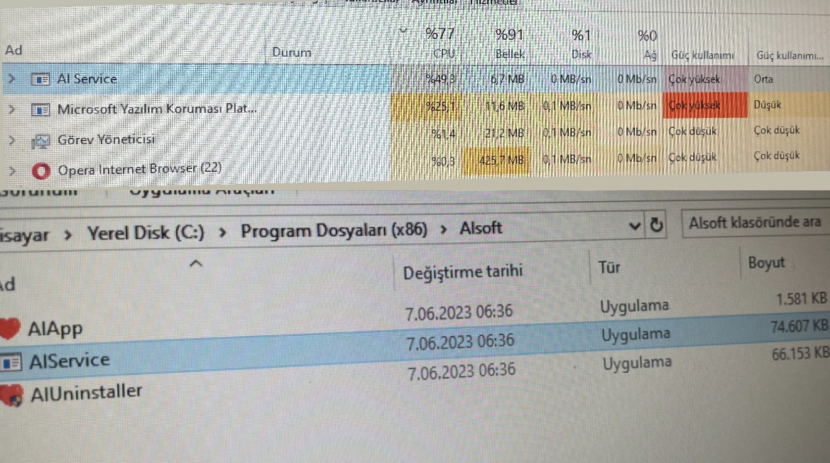 Merhaba, bilgisayarımda Görev Yöneticisi'ni açtığım zaman "all service" diye bir uygulamanın çok fazla işlemci kullandığını fark ettim. Bilgisayarı bir süre ablamla ortak kullandık, bu uygulamanın nereden yüklendiğini bilmiyorum ve kaldıramıyorum. Bu uygulamayı kapatmadan silemeyeceğimi söylüyor. Görev Yöneticisi'nden kapatıyorum, ancak tekrar açılıyor. Ne yapmalıyım?
