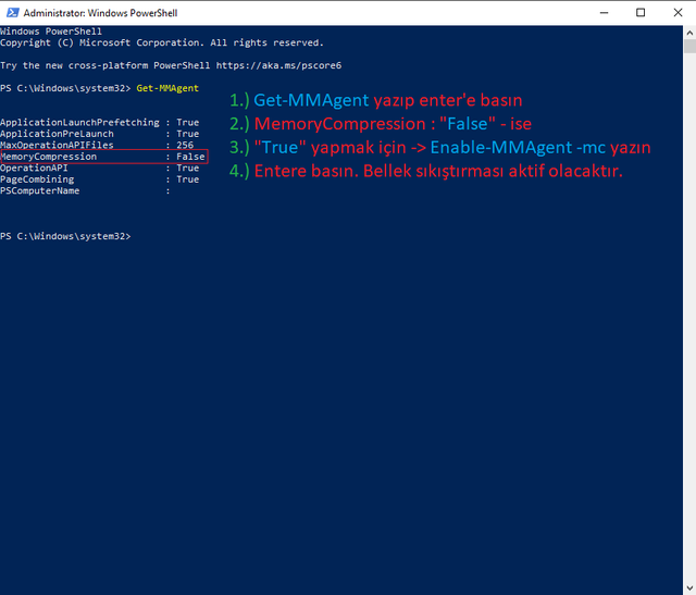 Daha sonra açılan konsola get-mmagent yazıp entere basalım. Eğer memorycompression değeri false ise aktif etmek için (true) enable-mmagent -MC yazıp entere basıyoruz. Bu sayede bellek sıkıştırmayı aktif etmiş oluyoruz. Yine kapatmak istersek ise enable-mmagent yazıp Enter'e basabiliriz.