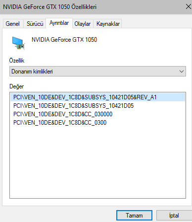 Özellikler>ayrıntılar menüsünden donanım kimliğini seçin.