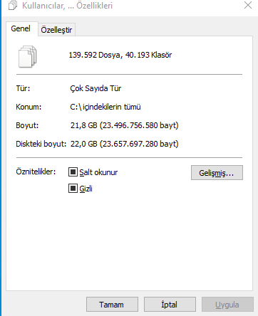 Merhabalar. Geçenlerde Windows 11'e geçmiştim ancak bir takım olaylar yüzünden Windows 10'a geri döndüm (ISO dosyası ile) ve hiçbir şey yüklememe rağmen C diskinde 104 GB boş yer var (222 GB SSD). Diskin içindeki dosyaların hepsini seçip özelliklere bastığımda sadece 22 GB