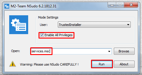 NSudo programında "Enable All Privileges" seçeneğine tik atın, sonra boşluğa "services.msc" yazıp Run diyin, açılan hizmetler penceresinde istediğiniz hizmeti hatasız kapatıp açabilirsiniz.