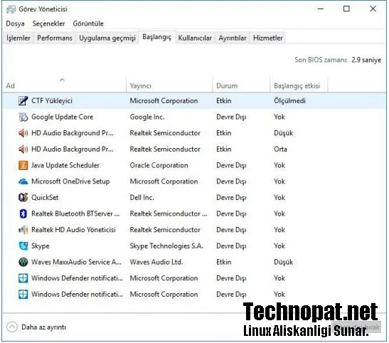 Görev çubuğuna sağ tıklayıp ya da Ctrl+Shift+Esc tuş kombinasyonunu kullanarak Görev Yöneticisi’ni açın ve Başlangıç sekmesine gidin. Tercihen ekran kartı ve ses aygıtı sürücülerine ait yazılımlar dışında kalan yazılımları devre dışı bırakın.