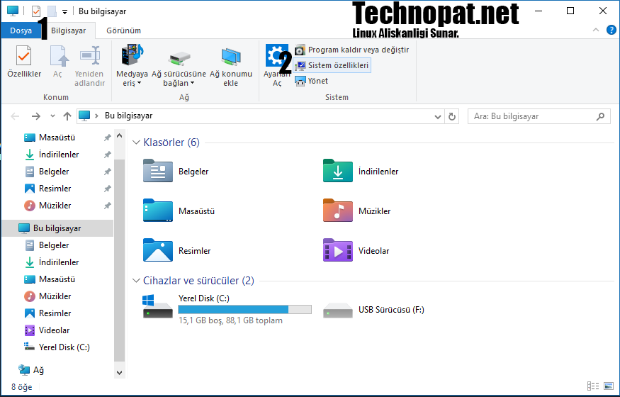 Öncelikle Dosya Yöneticisini açıyoruz ve üstteki sekmeden bilgisayara tıklayıp, ardından Sistem Özelliklerine tıklayın.