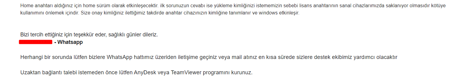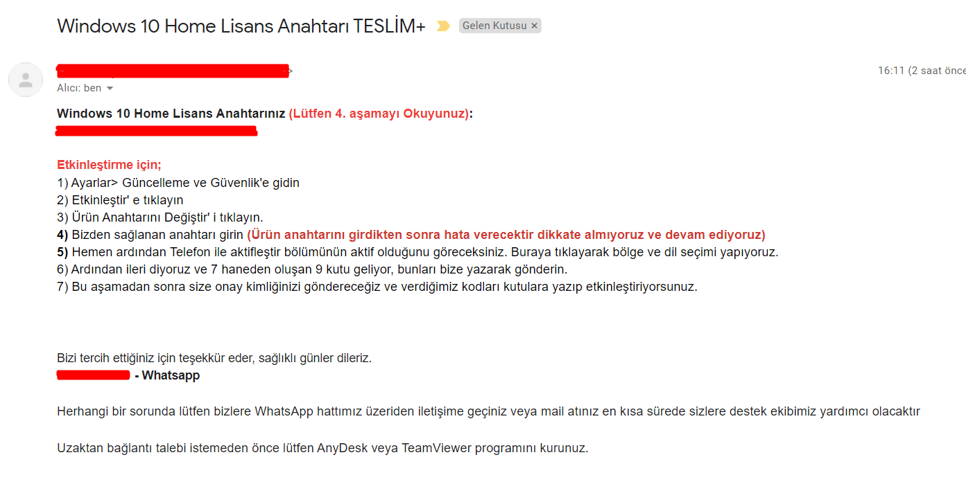 Bugün Windows 10 Home işletim sistemim için lisans anahtarı satın aldım fakat normal bir lisans anahtarı gelmedi. Satıcı şöyle bir mail attı. Bu işlemleri yapmam güvenli mi? Dedikleri gibi kodu verirsem bir sorun yaşar mıyım?