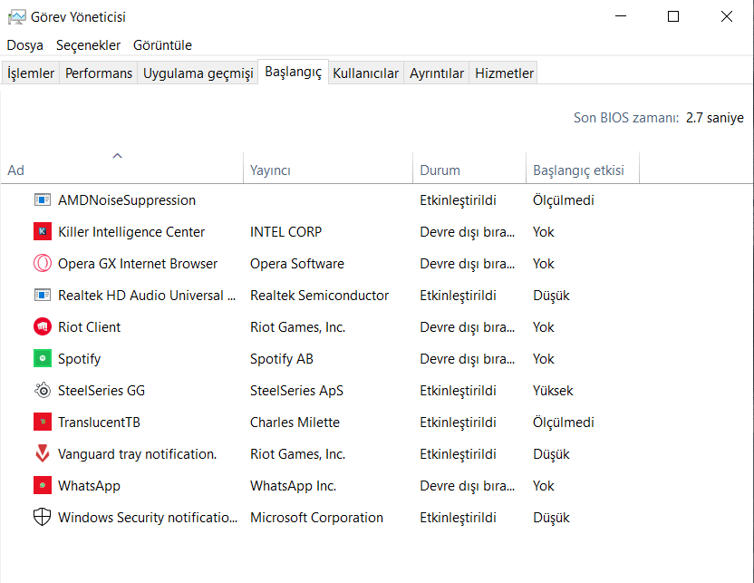 Merhaba, dün bilgisayardaki bazı sorunlar yüzünden temiz kurulum yaptım. Ayarlardan bulut üzerinden indirdim. Bilgisayarın açılması 1 dakikadan fazla sürüyor kapanması da aynı şekilde üretici logosu geliyor. O ekranda kalıyor. Görev Yöneticisi'nden başlatmaya baktığımda BIOS süresi 2.7 saniye olarak görünüyor. Bilgisayarımda sadece 1 tane SSD var ve temiz kurulumdan önce böyle bir sorun yoktu. Oyun performansında herhangi bir sorun yok aynı şekilde masaüstünde gezinirken de. Hızlı başlatma kapalı ayrıca BIOS'ta herhangi bir oynama yapmadım.