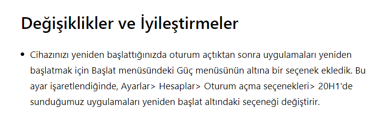 Microsoft yeni yama yayınladı. Bu sürümde bilgisayar kapatma kısmına; Bilgisayar yeniden açıldıktan sonra açık olan uygulamaları geri açma seçeneği eklendi.