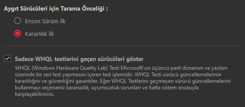 Sistemi olabildiğince güncel tutmaya çalışıyorum ama yaptığım Windows güncellemeleri, ekran kartı güncellemelerinden önce de sonra da bu sorun devam ediyor yani onlarla bir alakası olduğunu sanmıyorum. Driver'ları güncel tutmak için Steam'den "Driver Booster for Steam" adlı uygulamanın premium sürümünü kullanıyorum ve bu uygulamanın ayarlarından Driver'ları ait oldukları Official sayfalardan bulup kurması için "En son sürüm ilk" seçeneği yerine "Kararlılık İlk" seçeneği açık bir şekilde kullanıyorum.
