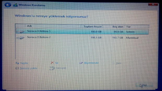 12- Windows'u yüklemek istediğiniz sürücüye basıp biçimlendir deyip ileri butonuna basın.