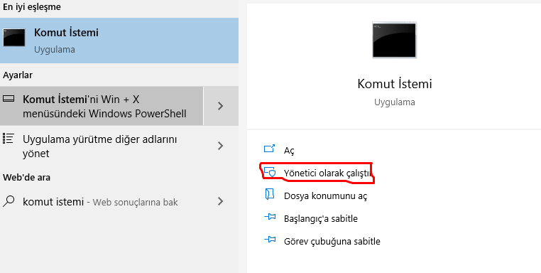 İlk önce arama kısmına komut istemi yazın ve yönetici olarak çalıştırın.