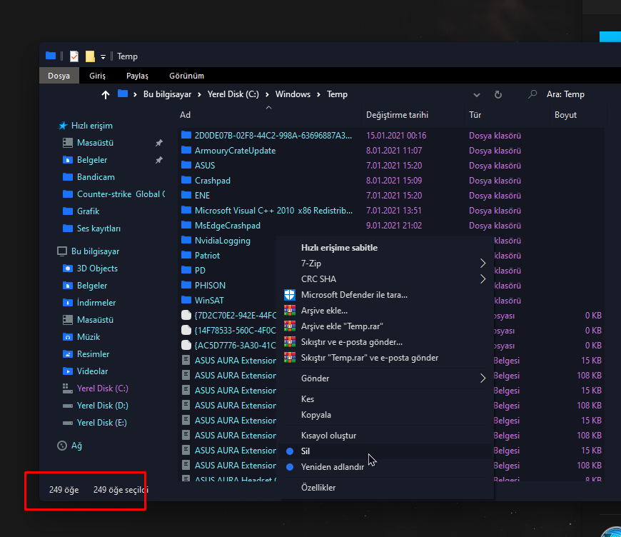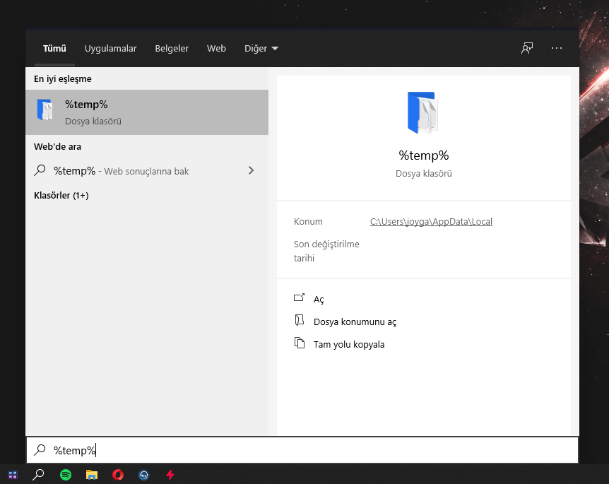• başlat > %temp%