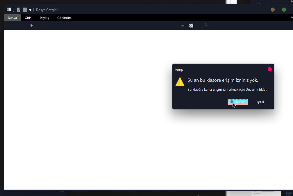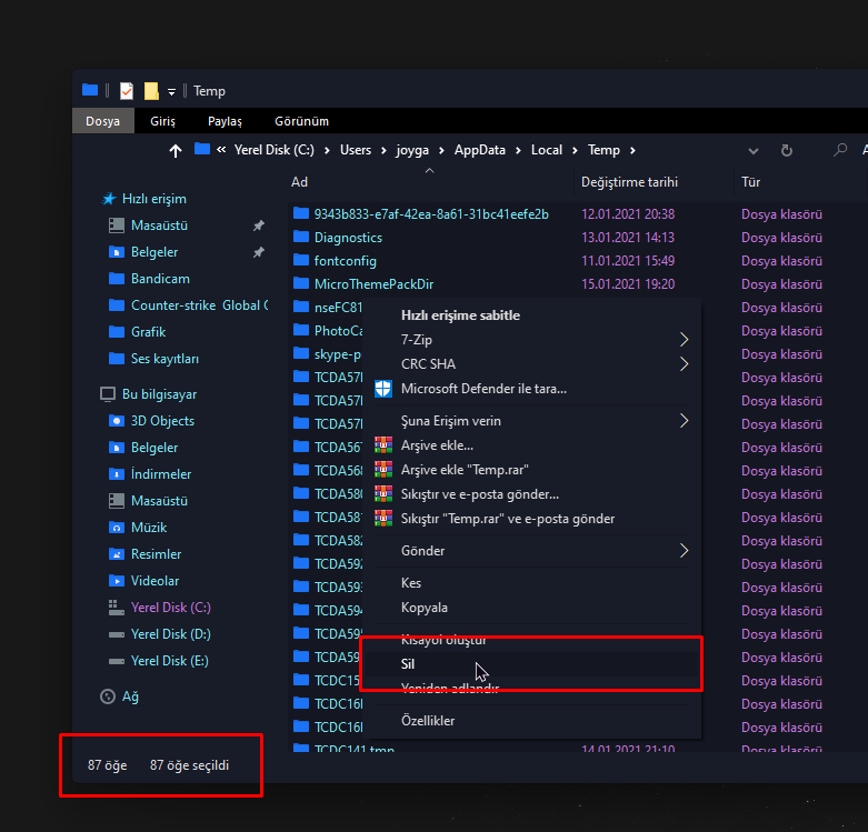 • Başlat > %temp%