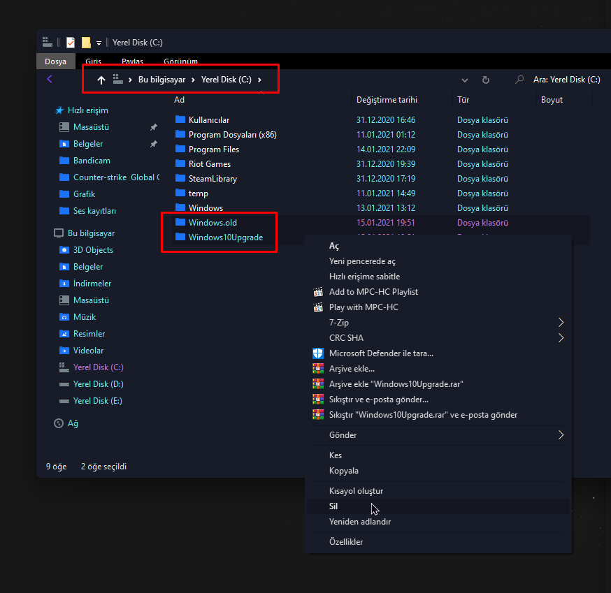 • C:\ >Windows.old ve Windows10Update dosyaları var ise silin.