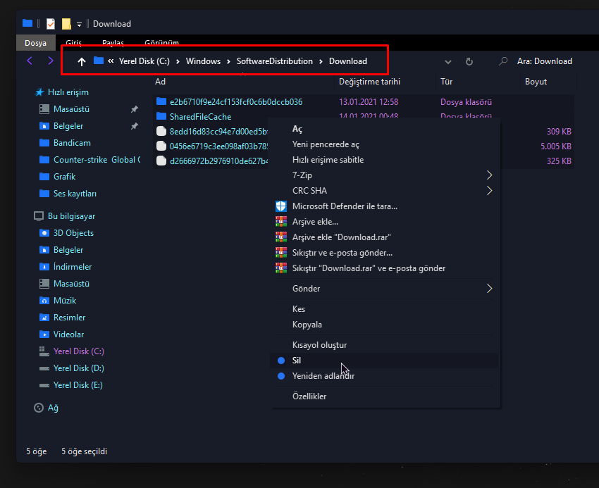 • Yazın ve klasöre gidin. Oradaki tüm dosyaları silin.