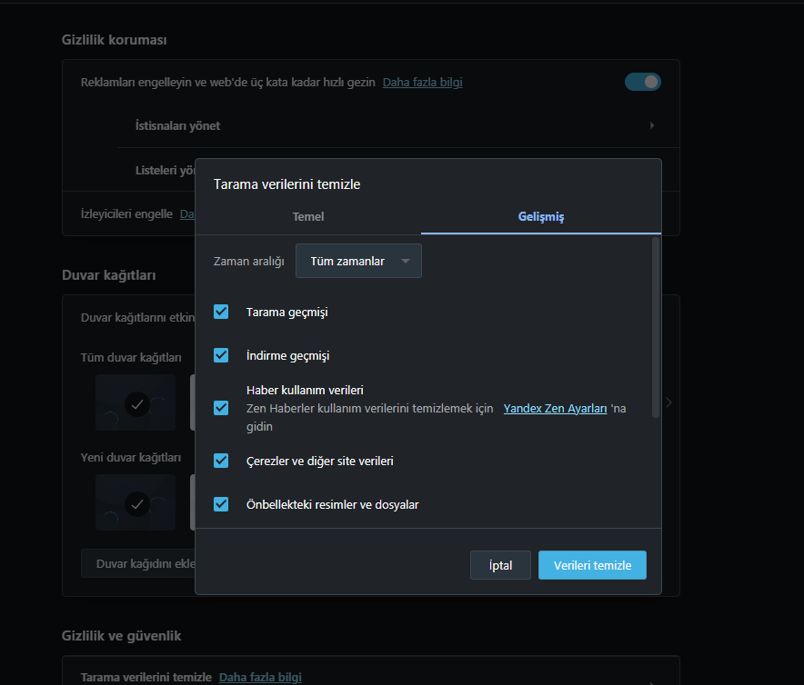 • Kullandığınız tarayıcıyı açın > Geçmiş > Tarama verilerini temizleye gidin ve tüm geçmişi seçip silin.