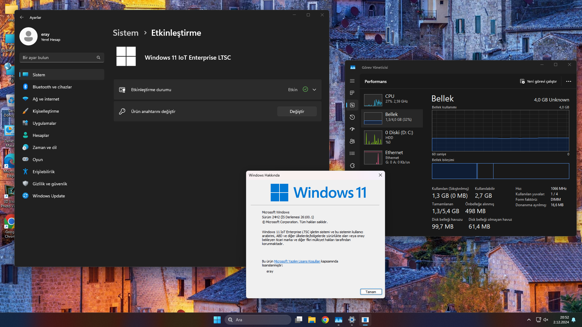 Windows 11 IoT LTSC 2024 1.2 GB RAM kullaniyor zaten(1.3 olduğuna bakma ayarlar falan açık olduğu için), acilen değiştirmen lazım o sürümü.