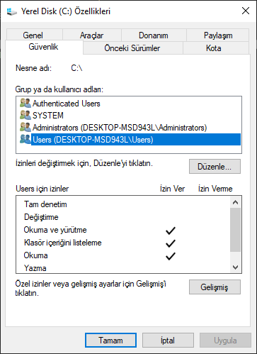 Temel izinleri tam denetim yaptım sorun aynı, sistemde tek kullanıcı hesabı var.