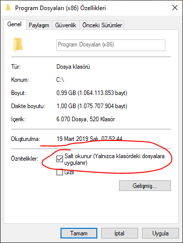 Yönetici çalıştırıp net user Administrator /active:yes yazdıktan sonra Administrator hesabıyla giriş yapıp dosyaların hala salt okunur olup olmadığını kontrol eder misiniz?