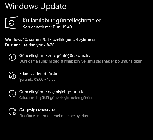 Windows 10 sürüm 20H2 güncellemesi hazırlanıyorda takıldı