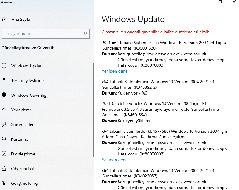 Arkadaşlar merhaba, 6 aydır Windows Update'e hiç bakmıyordum. Bugün bir bakayım dedim ve birden fazla güncelleme gelmiş. Güncellemeyi denediğimde 0x80070003 hatasını veriyor. Bu hatayı 4 aydır çözemiyorum. Hata kodunu arattım, çözümler işe yaramadı. Sizce bu hatayı nasıl çözebilirim?