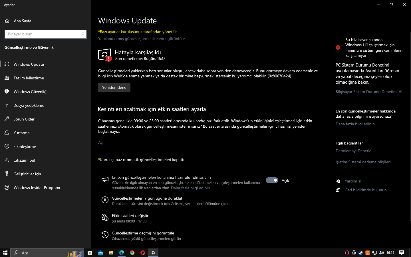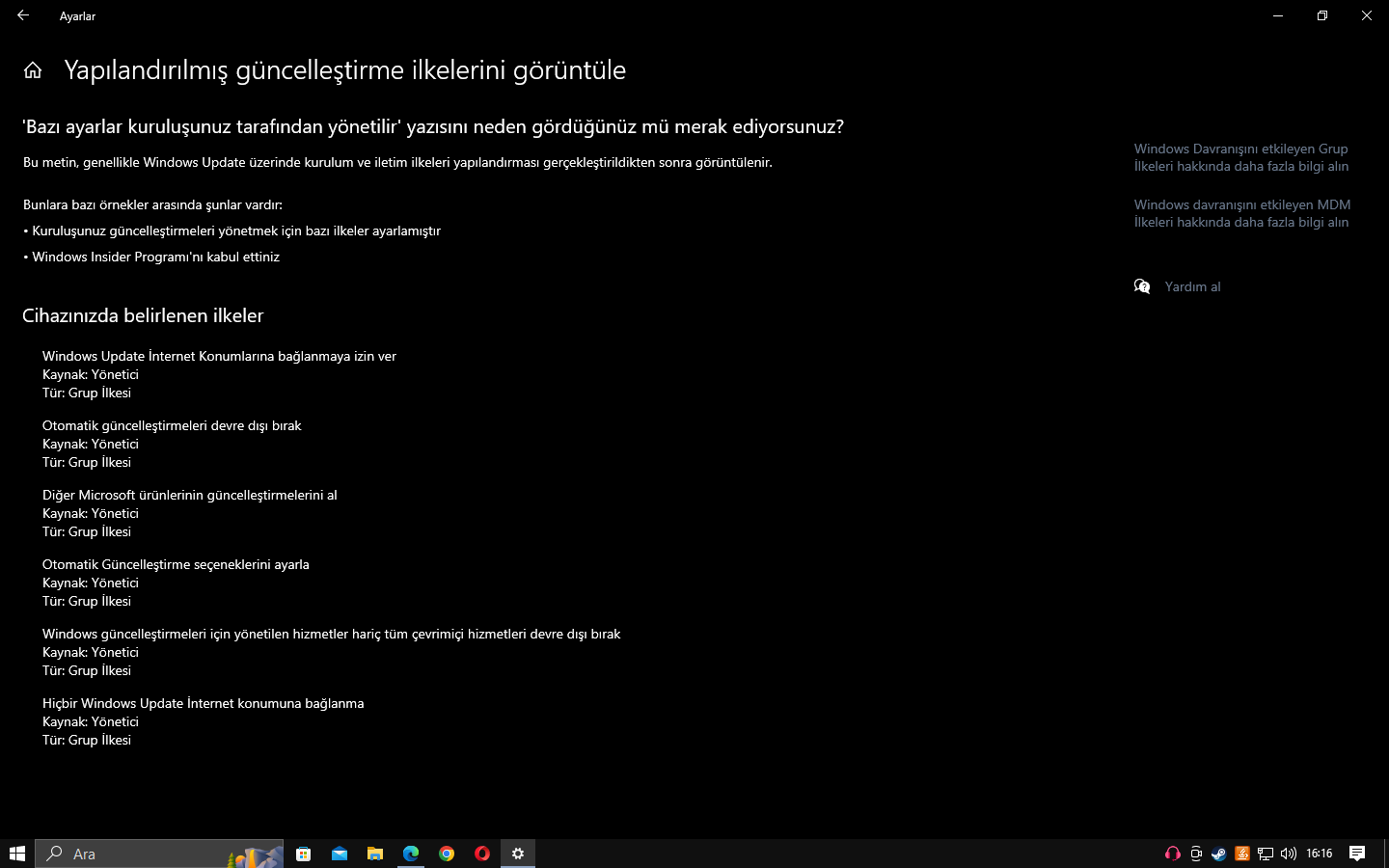 Windows güncellemelerini yapmak için Update'e girdim ve hatayla karşılaşıldı şeklinde bir yazı yazıyordu. Bilgisayarı yeniden başlattım ama gene çözülmedi. Birkaç yerde softwaredistrubiton adlı dosyayı silersem durumun düzeleceği yazıyordu fakat silmeme rağmen durum düzelmedi. Fotoğrafta da belirtildiği üzere yukarıda yapılandırılmış güncelleştirme ilkelerini görüntüle yazısına basınca farkı bir ekran açılıyor ve Update'i tahminimce etkileyen şeylerin bunlar oldugunu düşünüyorum.
