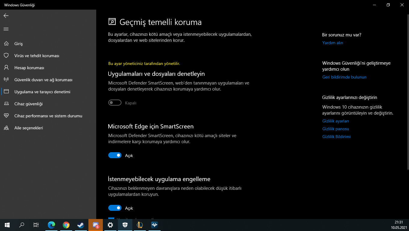 Merhaba kolay gelsin. Windows 10 güvenliği > uygulama ve tarayıcı denetimi > geçmiş temelli koruma ayarları içerisinde uygulama ve dosyaları denetleyin ayarını açamıyorum. Bu ayar yöneticiniz tarafından yönetilir diyor. Bu sorunu nasıl çözebilirim?