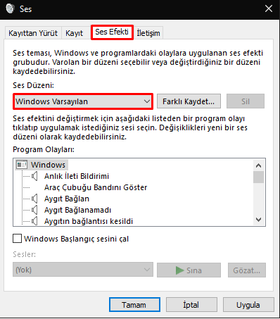 Eğer bu seçeneği devre dışı bırakmak istiyorsanız, yukarıdaki konumdan karşınıza çıkan pencerede, Ses Efekti sekmesine geliniz ve Windows Başlangıç sesini çal seçeneğini devre dışı bırakınız.